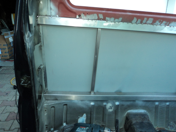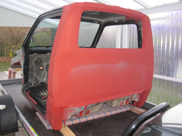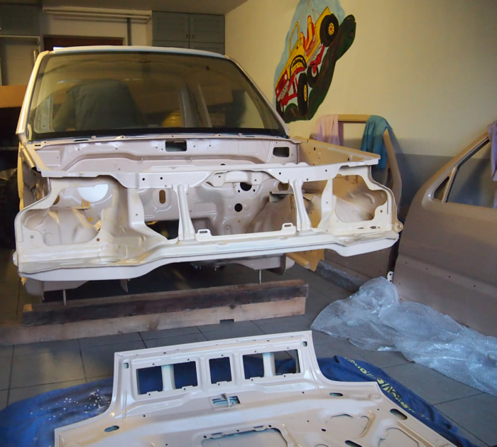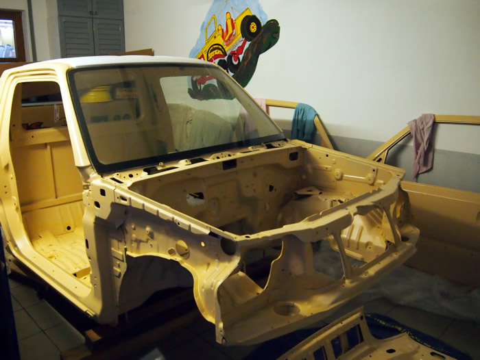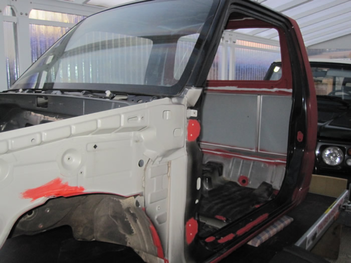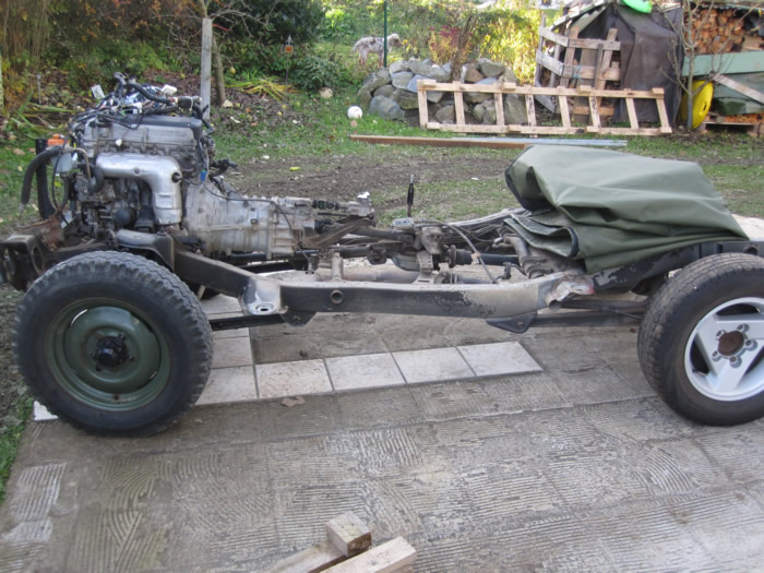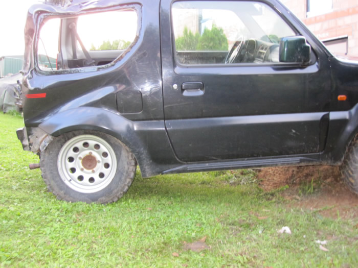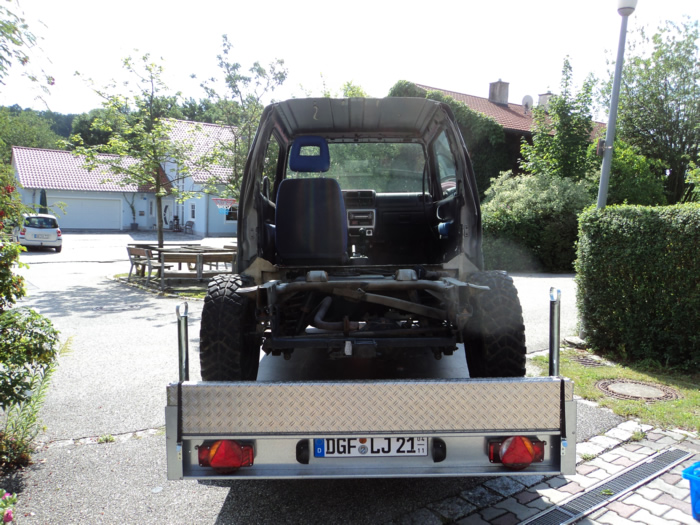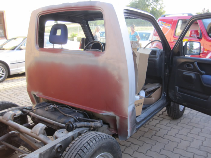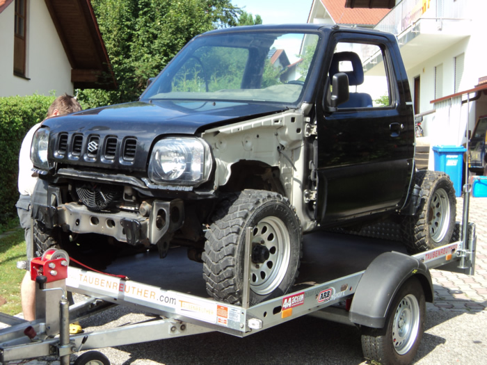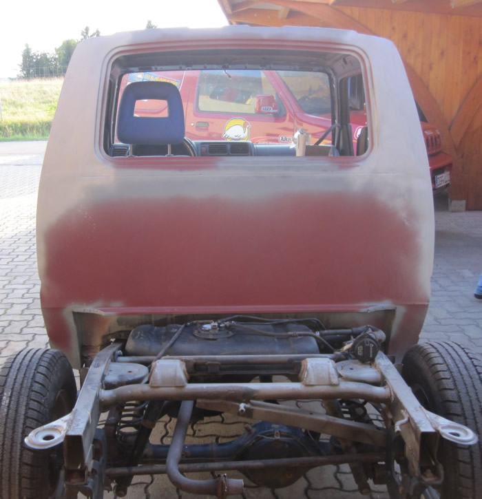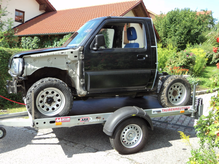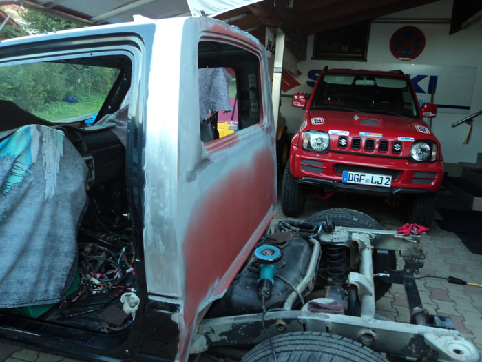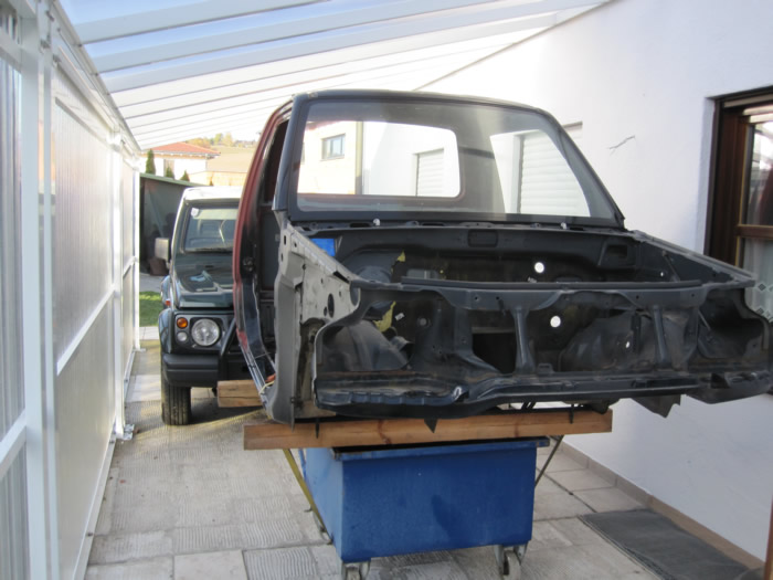 Im August habe ich mir einen JB43 mit Heckschaden gekauft. Schnell war die Idee geboren, diesen zu einem Pickup umzubauen. Nachdem wir die gesammte Karosse in Form gezogen und gebogen haben, wurde der hintere Teil des Führerhauses abgetrennt, ein Rahmen eingeschweißt, Fenster rein, Blech drauf und fertig :). Im November wurde dann Füherhaus vom Fahrgestellt getrennt. Nach intensiven Korrosionsschutzbehandlungen ist der Body nun beim Lackierer. Der Jimny Pickup wird sandfarben, das Dach weiß! Alle weiteren Pläne verrate ich hier noch nicht 🙂